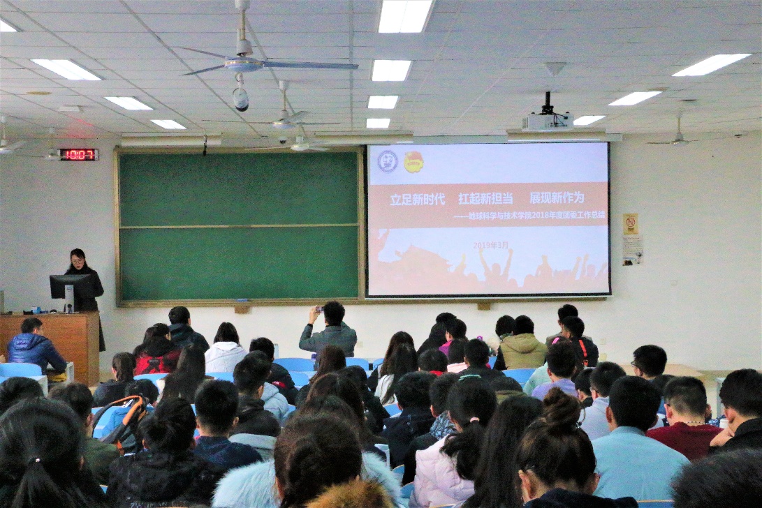 大会伊始,团委委员姜雪作学院2018年团委工作总结,从思想政治引领、基层组织建设、改革任务、第二课堂四个方面汇报了学院团委的特色工作。2018年,地学院团委立足新时代、扛起新担当、展现新作为,取得了显著的育人成效。随后,本科生学生会主席王俊豪和研究生学生会主席于蔡欣达分别代表学生组织作2018年工作总结及2019年工作计划,学生会以提高学生思想高度、强化学生工作能力为基础,全心全意,群策群力,为地院学子打造了“尖兵计划”“地语师说”等一系列精品活动。辅导员张敏为本学期即将到来的思美节及文化艺术节作相关部署安排,继续延续 “我为地院代言” 等精彩活动,为学校“纪念五四运动100周年大型文艺晚会”蓄力筹备。
