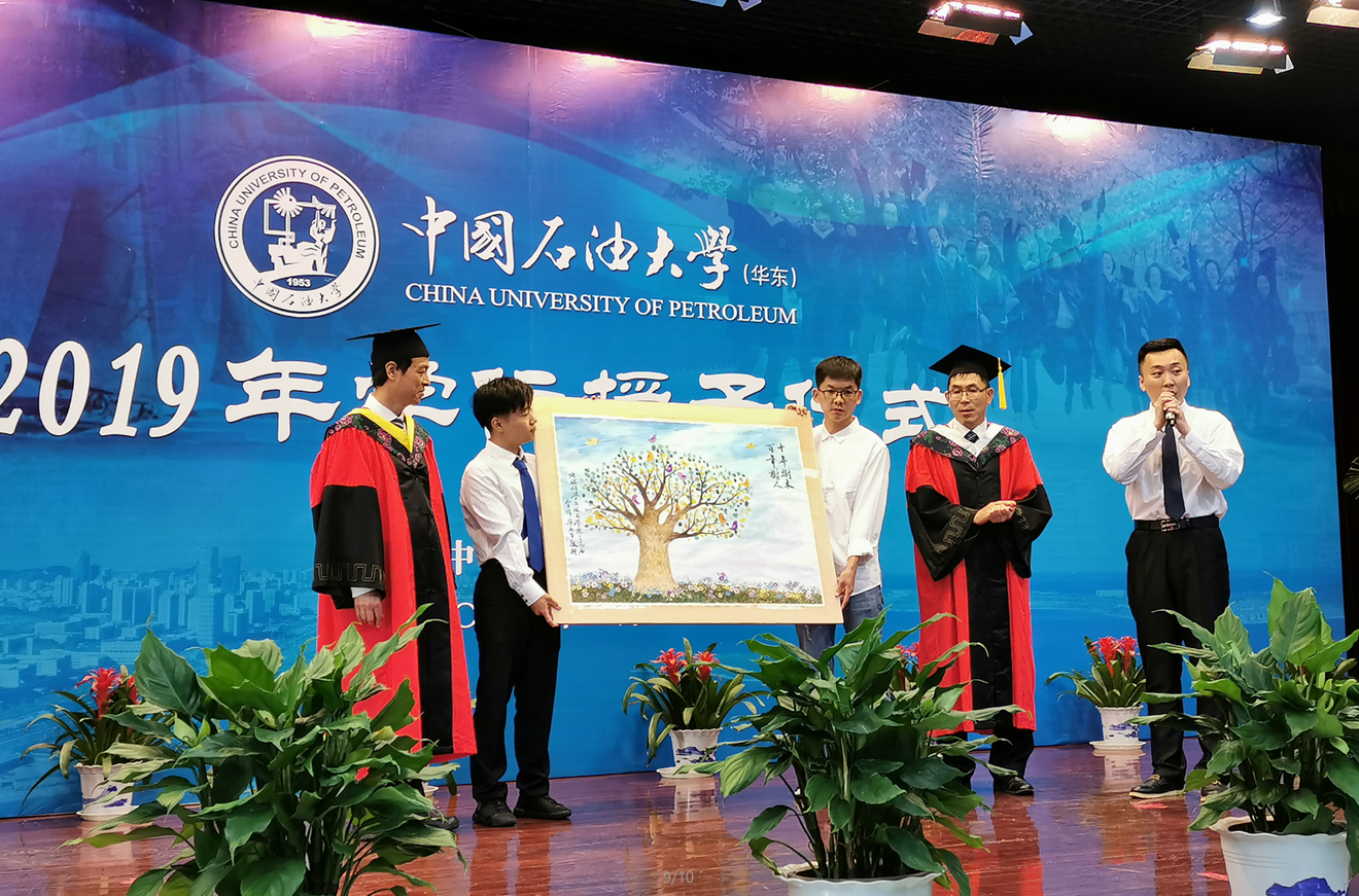 2015级本科生许旺、张岩代表全体毕业生为学院赠送礼物。“这幅名为’十年树木 百年树人’的画作由地学院2019届毕业生共同完成,画中的树干代表学校以及学院为我们提供的支持和平台;全体毕业生一起按下的指印作为树叶,寓意着我们在学院的支持下茁壮成长;树下铺满了勿忘我花草,象征我们永远会记得在母院学习和生活的日子,会记得老师们的谆谆教诲,会记得同学们之间的深厚情谊。也借这份礼物祝福母院十年树木,桃李满天下,百年树人,栋梁荣中华!”毕业生代表张岩说道。