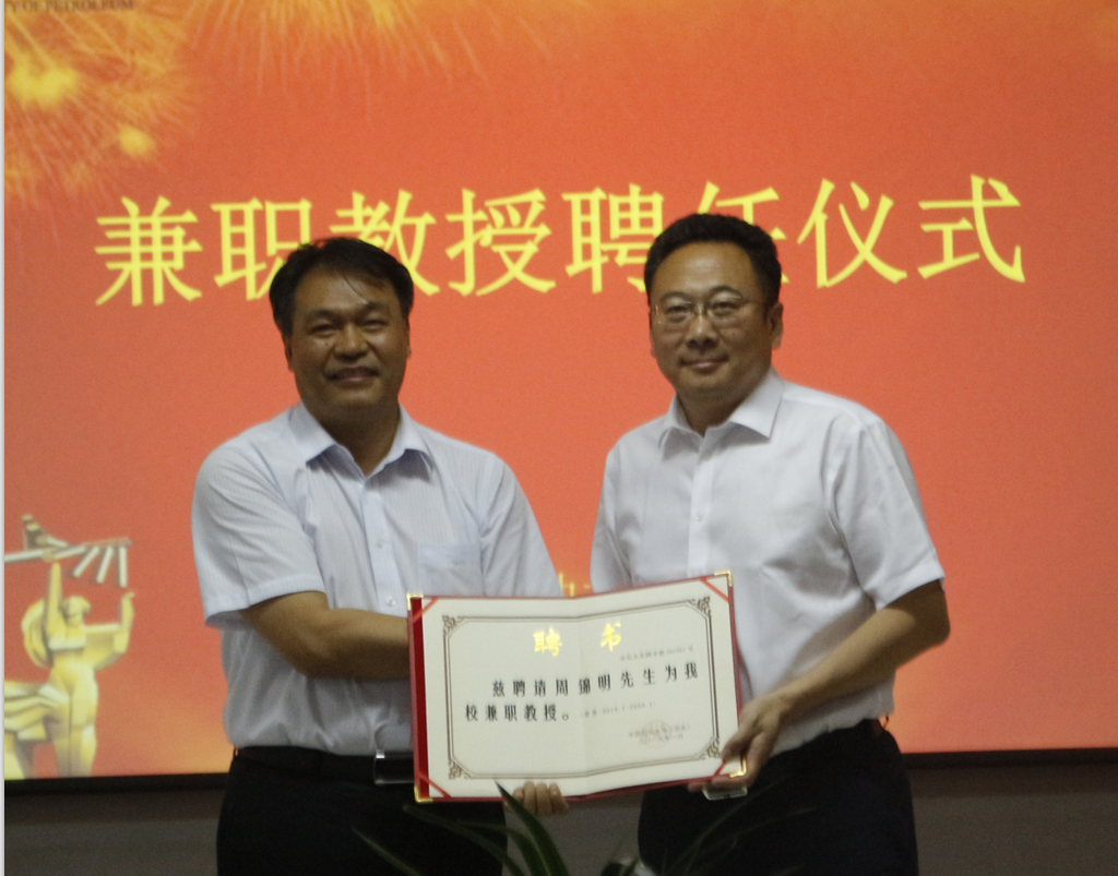 聘任仪式由地学院院长林承焰主持。他介绍了两位校友学习和工作等历程,对其受聘为学校兼职教授表示热烈祝贺。他指出校友是学校宝贵财富,希望通过聘任的方式更好地促进学校建设,提升学科建设水平和人才培养质量。