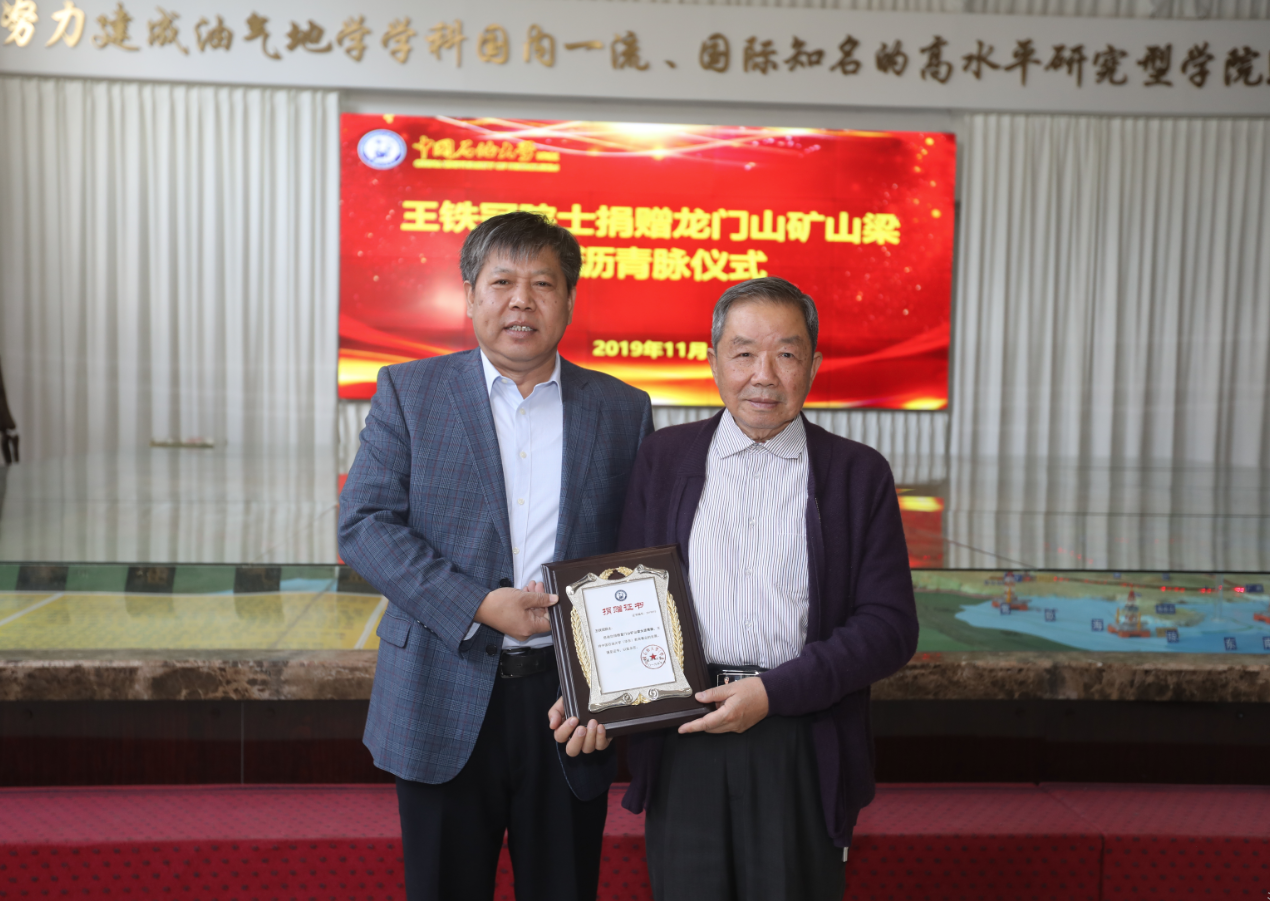 王铁冠院士为学校发展建设倾注了大量心血,在繁忙工作的同时,花费很多精力,在舜天矿业协助下, 几经周折将龙门山矿山梁大沥青脉标本从四川运至青岛。捐赠仪式上,他谈了自己与这块从数千公里外寻获的“黑石头”的机缘,说明捐赠龙门山矿山梁大沥青脉的原因:龙门山矿山梁大沥青脉是中国近代历史上发现、应用最早的沥青脉,历史价值深厚;其储量大、数量多、体积大,具有很高的研究价值。他希望,这块沥青标本能够成为石大石油地学教学中的教科书,帮助塑造石大学生学习地球科学的氛围,培养学生热爱地质的精神,打造优秀的地学文化。