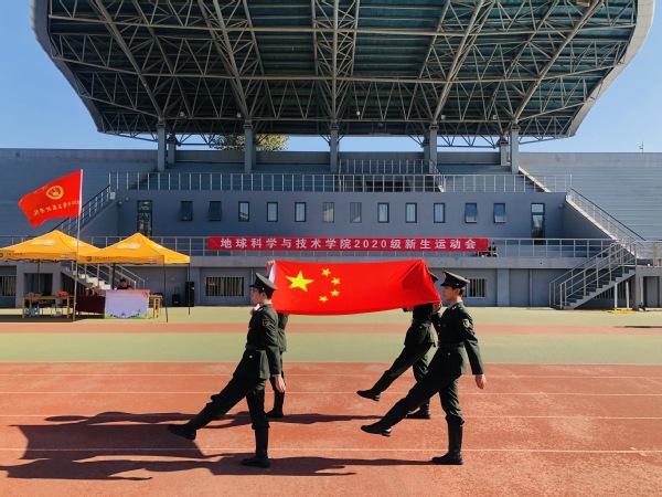 开幕式伊始,升国旗,奏唱国歌,全体人员行注目礼。徐永涛致开幕辞,他鼓励同学们一方面要积极参加体育运动,养成良好的锻炼习惯,通过体育锻炼强身健体,提高学习和工作效率;另一方面要踊跃参加集体活动,促进班级凝聚力,加强集体建设,未来要努力在学校运动会上展现勘探尖兵风采。随后,资源勘查工程20级01班刘牧原和资源勘查工程18级01班高火青分别代表运动员和裁判员进行宣誓,徐永涛宣布此次新生运动会正式开始。