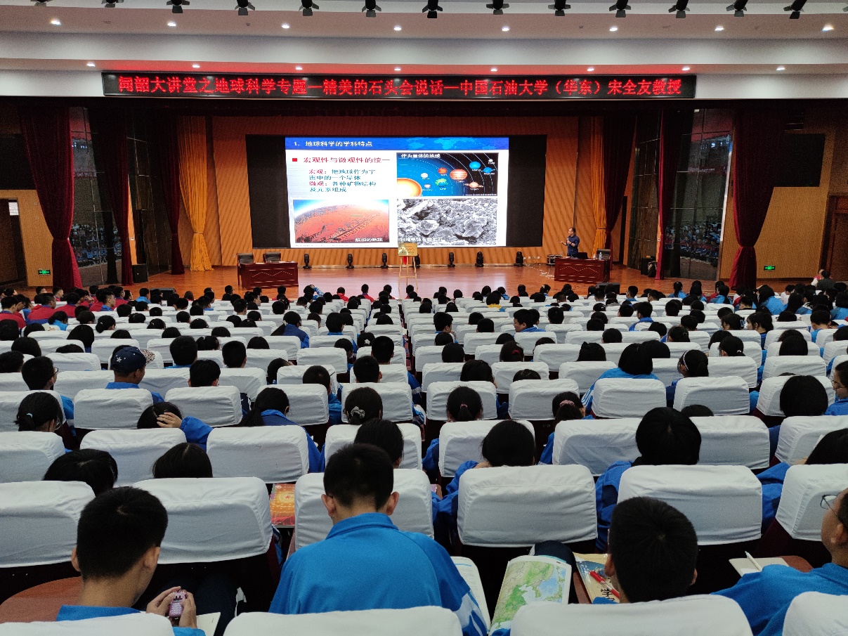 随后,宋全友老师为1200余名学生作了题为《精美的石头会说话》的主题报告。从地球圈层结构到珠峰高度,从西太平洋马里亚纳海沟到各种地质活动,宋老师用诙谐幽默的语言,向同学们展示了地球的发展演化历史,带领大家走进一个神秘又妙趣横生的地球科学世界,赢得了同学们热烈的掌声。宋老师劝勉同学们对待学习要从认识到了解,从了解到掌握,一步一步形成自己的知识架构,激发了学生探索地球科学的兴趣。