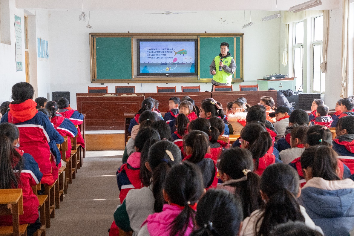 仪式后,春晖志愿服务队为华兴希望小学的孩子们送上了一堂别开生面的地球探索科普教学。志愿者马文钊以“有趣的海洋地质”为题讲解海洋科普知识,给孩子们带去了内容丰富、精彩纷呈的公益课程,寓教于乐之中,激发小朋友们对地质知识的热情和兴趣。在场学生积极思考并踊跃答题,课堂气氛热烈活跃。