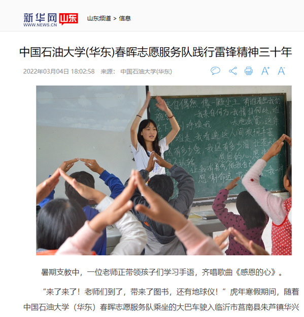 编者按:近日,学习强国首页【推荐】栏目以《必赢bwin线路检测中心(华东):学子三十年接力 续写新时代的雷锋故事》为题,宣传报道必赢bwin线路检测中心春晖志愿服务队三十年志愿服务事迹。同时,该事迹还被新华网、中国青年报、中国教育新闻网、中国青年网、青岛日报社观海新闻等十余家上级媒体宣传报道。
