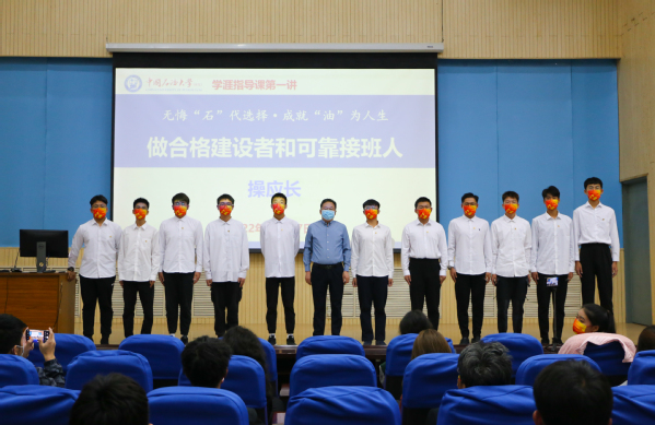 课程最后,操应长为2022级学生代表佩戴校徽。同学们挺起胸膛,操应长将校徽端正地佩戴在他们胸前,既意寓着石大精神的接续传承,更饱含着深情厚望,“作为新一届地学院学子,大家要不忘初心、牢记使命,努力做德智体美劳全面发展的社会主义建设者和接班人,为保证国家能源安全担当更大责任、贡献更大力量!”