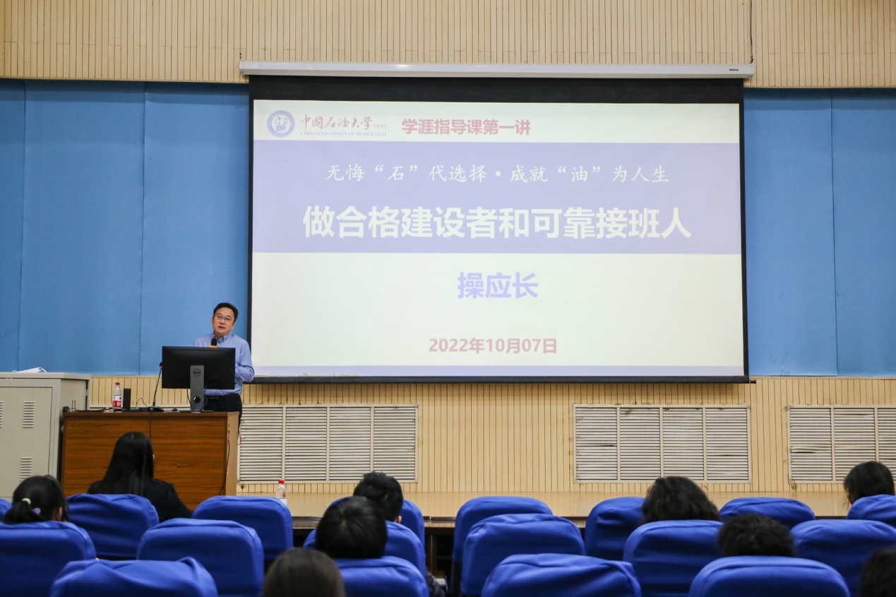 10月7日下午,学院2022级本科新生迎来期待已久的“学涯指导第一课”。在这堂具有特殊意义的课上,副校长操应长教授的授课内容生动深刻,同学们专注聆听、认真做好笔记。这堂课让他们更好地了解“石油”两字背后的含义,加深了对国家能源行业发展大势的认识,更坚定了依靠专业学习和技术创新保障国家能源安全的信心和决心。