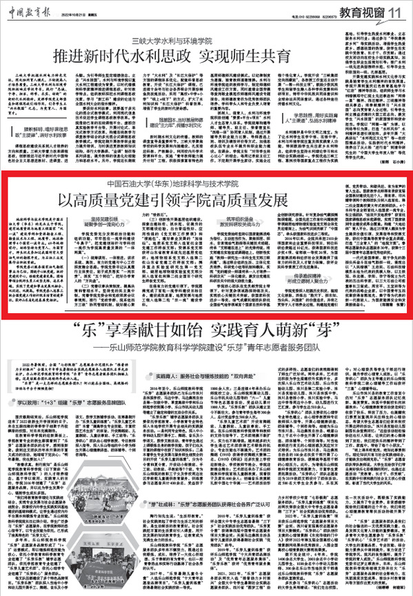 学院党委深入挖掘历史积淀,梳理文化根脉,淬炼出“勘天下、探未知、当尖兵、兴国家”的价值追求,并将之贯穿于人才培养全过程,构建起党建引领、党员带动、和谐共进、有为有声的育人生态。国家教学名师蒋有录获首届全国教材建设先进个人,蒋有录、印兴耀带领两个教师团队分别入选首批、第二批全国高校黄大年式教师团队,4个本科专业全部首批入选国家一流专业,张立强团队“油田开发地质学”获首批国家课程思政示范课程,实现了国家级别专业建设成果全覆盖。构建“大地经纬”育人平台,通过25项育人载体为学生提供价值引领、发展指导和资源支持,获批中国高等教育学会重点课题,打造三全育人的“地院方案”。春晖志愿服务队志愿服务30年,获第十三届中国青年志愿者优秀组织奖。