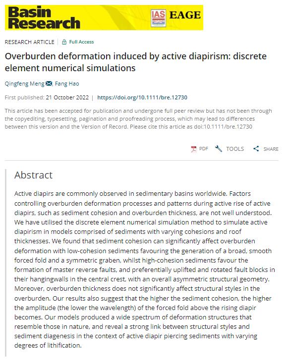 【本站讯】近日,学院郝芳院士团队在地质过程数值模拟研究方面取得重要进展,相关成果《主动底辟作用引发的上覆岩层变形:离散元数值模拟》(Overburden deformation induced by active diapirism: discrete element numerical simulations)发表于地球科学领域国际著名学术期刊《Basin Research》。论文作者为孟庆峰教授和郝芳院士,第一署名单位为必赢bwin线路检测中心(华东)。该研究得到青岛海洋科学与技术国家实验室“十四五”重大项目基金、国家自然科学基金创新群体和山东省泰山学者研究基金联合资助。