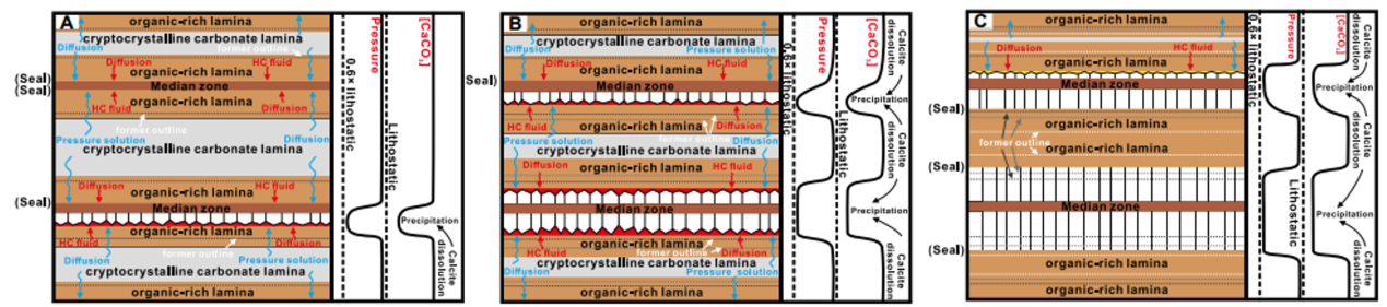 该项工作在前期排烃超压流体研究成果的基础上,以渤海湾盆地东营凹陷富有机质纹层状烃源岩中背生式顺层纤维状方解石脉体(Antitaxial, bed-parallel fibrous veins)为研究对象,通过脉体岩相学、流体包裹体、微区同位素及微量元素分析,在确定脉体是生烃增压导致流体异常高压的产物基础上,再结合单个纤维状晶体中间面两侧微区地球化学组成上的差异,明确了该类脉体的形成经历了与流体超压压裂过程相关的两个独立的裂缝开启-愈合阶段,证明了不对称生长的脉体是对烃源岩幕式排烃过程的直接记录,并基于此构建了幕式排烃模式。该成果有助于加深对烃源岩生排烃过程以及页岩油气成因机制的相关认识。