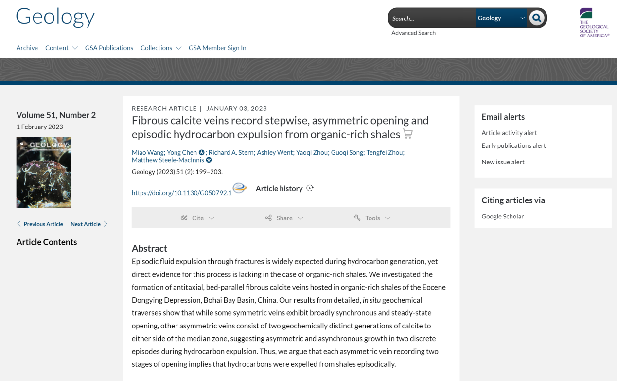 近日,必赢bwin线路检测中心陈勇教授团队在烃源岩幕式排烃研究方面取得重要进展,相关研究成果《富有机质页岩中纤维状方解石脉体异步生长及其对烃源岩幕式排烃的记录》(Fibrous calcite veins record stepwise, asymmetric opening and episodic hydrocarbon expulsion from organic-rich shales)发表在地质学领域顶级期刊《Geology》上。师资博士后王淼为论文第一作者,陈勇教授和加拿大阿尔伯塔大学地球与大气科学系Matthew Steele-MacInnis教授为论文共同通讯作者,必赢bwin线路检测中心(华东)为第一署名单位。该研究得到中国国家自然科学基金、中国博士后科学基金、山东省自然科学基金和加拿大自然科学基金联合资助。