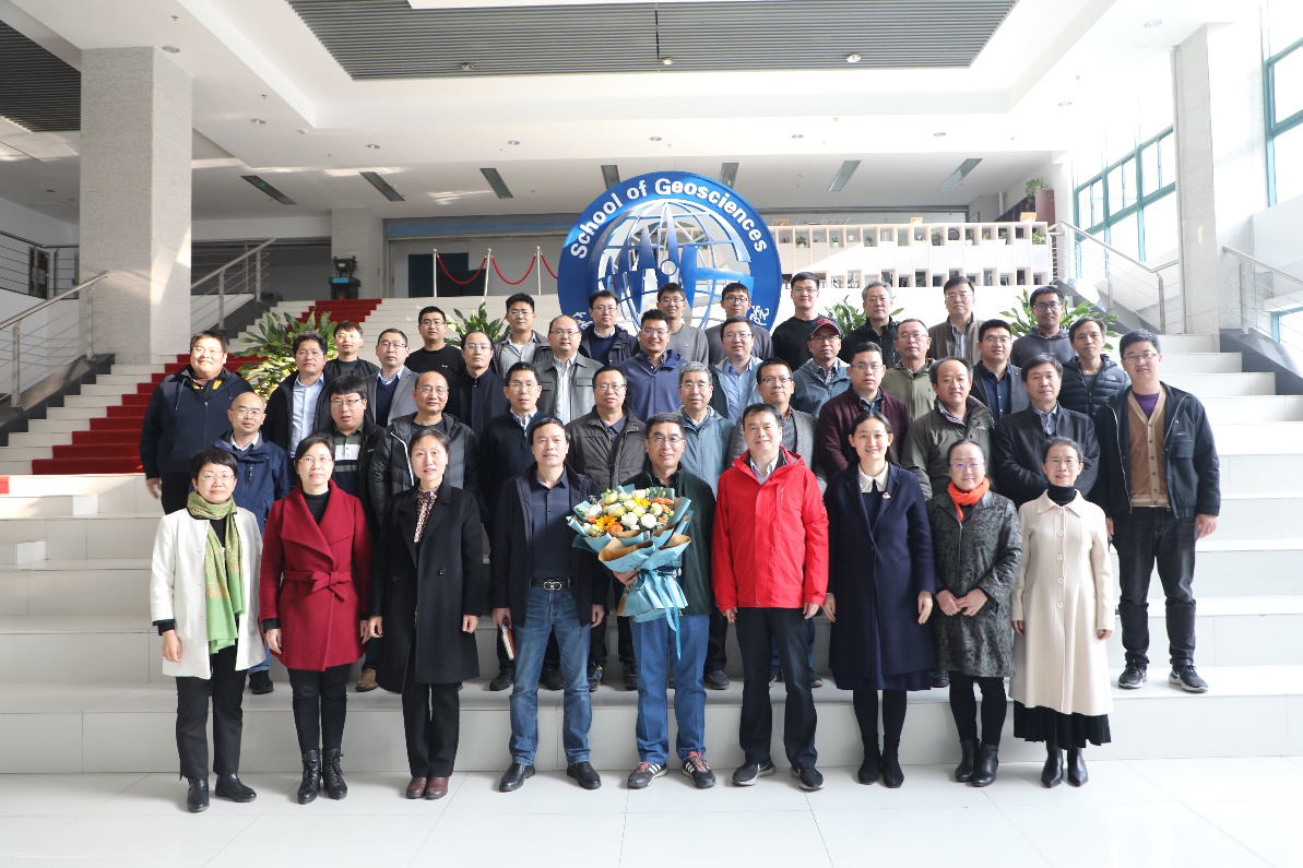 会上,郑珊珊、张军华和吴孔友分别代表学院、工会和地质系向马玉新老师赠送了定制奖牌、鲜花和荣休纪念品。最后,全体人员合影留念。