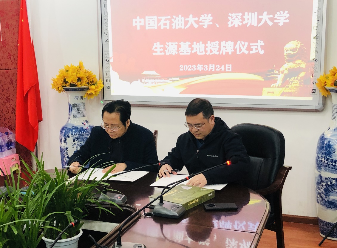 郝传宝、谭宝海两位老师应优秀生源基地——青海师范大学附属中学之邀参加招生咨询会并进行回访,3月24日抵达西宁,25日进校园宣讲并给学生和家长解疑答惑,与中学校领导、教务负责人及部分教师进行了座谈,对师大附中近几年为学校培养输送了优秀生源表示感谢。27日两位老师到西宁市第二中学,谭宝海给部分成绩优秀的学生作了《石大,在最美的季节,遇见你》的宣讲报告,让学生们多角度、全方位了解必赢bwin线路检测中心(华东),激励学生认真学习,引领优秀学生加盟学校。郝传宝代表学校与西宁二中签署了《优秀生源基地建设协议书》,并为“优秀生源基地”授牌,双方进行了座谈交流,双方表示将进一步加强沟通与合作,积极探索大学与中学合作育人的新模式,希望西宁二中继续为学校培养输送更多更优生源。