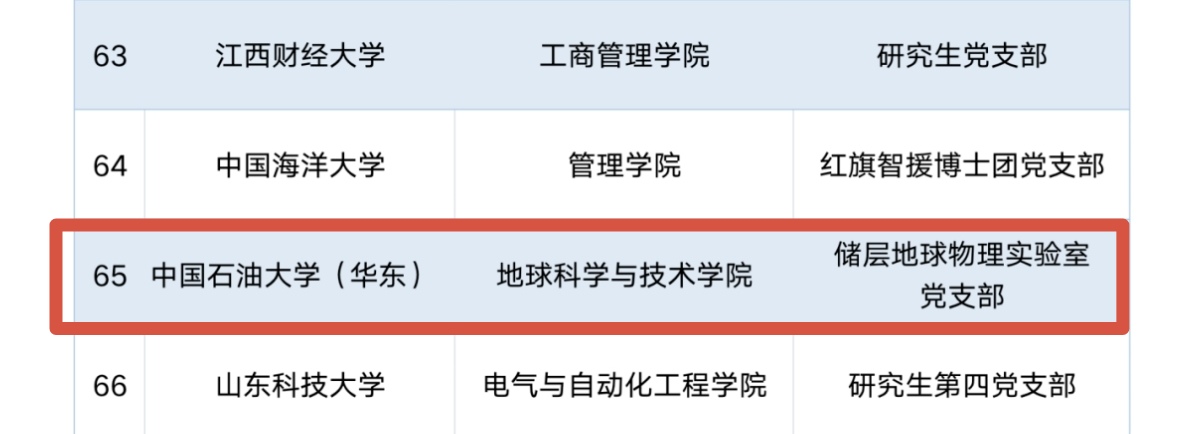 样板建设期间,实验室教师团队入选第二批“全国高校黄大年式教师团队”,获山东省优秀研究生导学团队;支部成员参与春晖志愿服务队获中国青年志愿者优秀组织奖,作品获“挑战杯”全国大学生课外学术科技作品竞赛一等奖;依托党支部建设经验形成的案例获全国高校思想政治工作优秀案例二等奖、青岛高校思想政治工作集体创新奖。支部中涌现出人民网奖学金、国家奖学金获得者等一大批党员先锋。党支部本着“建设、发展、服务、创新”的工作理念,坚持发扬“艰苦奋斗、敢为人先”的勘探精神,以育人为核心,以组织为保障,以服务党员群众的学习科研为工作重点,将继续发挥支部培养油气勘探行业优秀人才的“摇篮”作用。