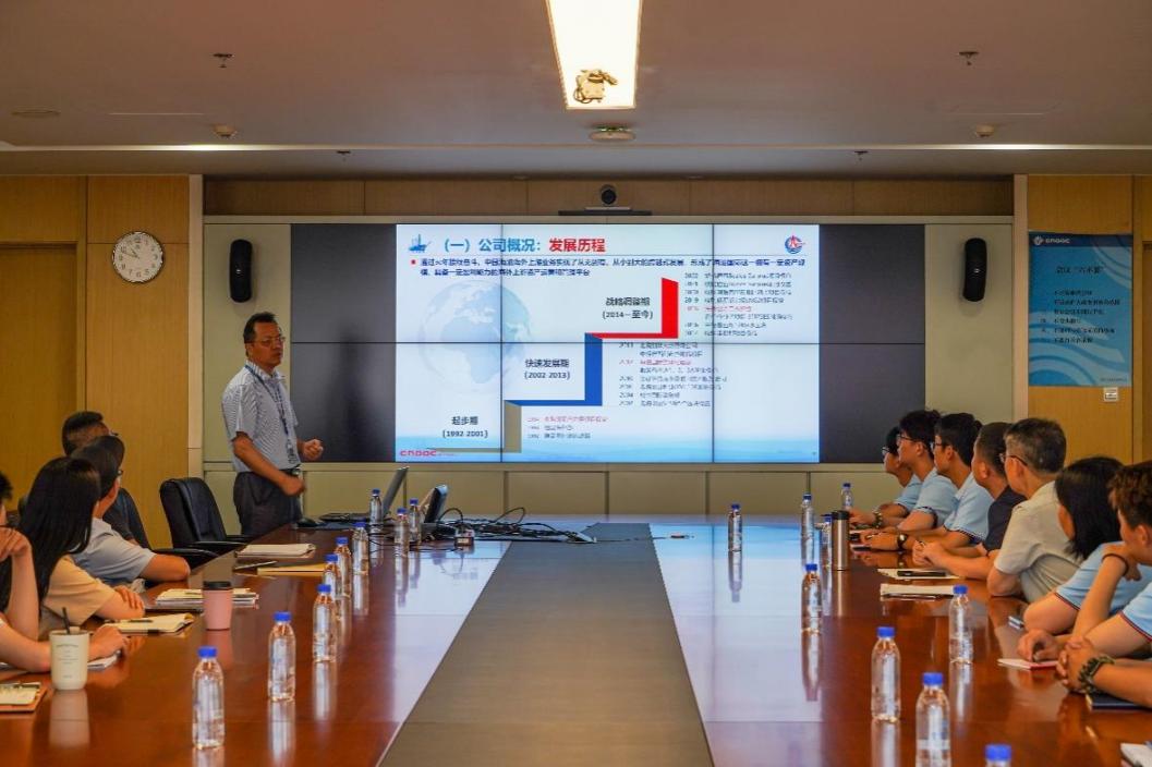 参观结束后,实践团前往中国海洋石油国际有限公司,与公司领导、部分校友进行座谈交流,海油国际海外技术支持中心主任彭文绪向实践队成员介绍了中国海洋石油国际有限公司的公司结构及科研现状,他表示“碧海丹心,能源报国”是中海油的企业文化核心,中海油公司始终以科技体制机制创新为核心动能,聚焦海上油气增储上产、数字化和新能源两个转型、科技创新攻关和成果转化过程所中存在的“堵点”、“卡点”问题,设立科研组织区、成果转化区、聚才育才区、协同创新区,建立高端智力资源使用为核心的新型科研组织模式,实施科研经费专项投入机制和科研经费“包干制”,全面支撑基础研究、关键核心技术攻关、高水平科研平台建设、高端人才引进和科研成果转化。实践团成员就石油发展现况、企业招聘需求及个人成长发展等方面展开深入交流。校友们建议,英语是每一位中海油人必须掌握的技能,希望必赢bwin线路检测中心(华东)的学弟学妹们在强化专业课的学习的同时兼顾外语的学习,还要不忘家国情怀,始终秉持艰苦奋斗、能源报国的初心,尽快成长为石油勘探领域的全能型人才。