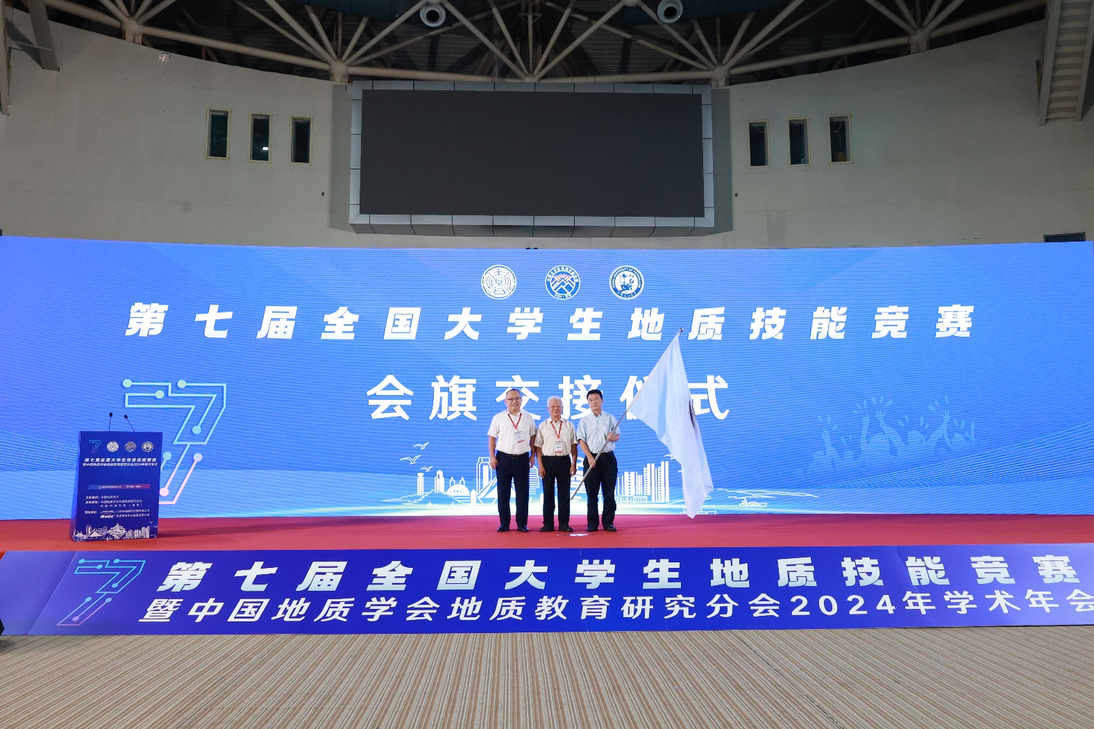 闭幕式上,中国地质学会地质教育研究分会副主任委员兼秘书长、中国地质大学(北京)副校长刘大锰,必赢bwin线路检测中心(华东)副校长周鹏和赞助商代表北京普瑞赛司仪器有限公司、麦克奥迪实业集团有限公司代表致辞。大会为获奖高校参赛队伍颁奖,并举行第八届全国大学生地质技能竞赛授旗仪式。