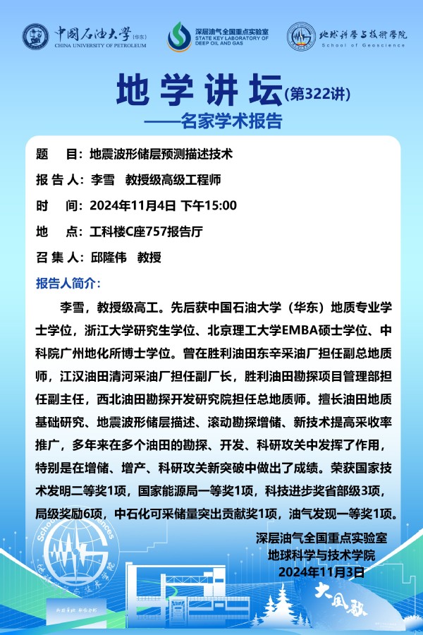 【地学讲坛第322讲】关于李雪 教授级高级工程师《地震波形储层预测描述技术》学术报告的通知