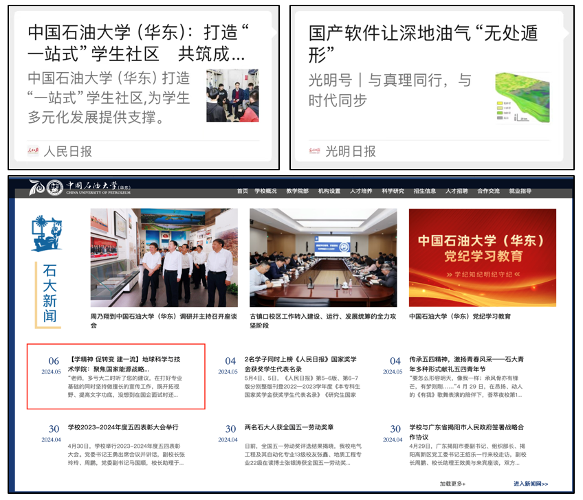 今年以来,学院涌现出许多一批有温度、有深度、有热度的典型报道,多篇登上《人民日报》《科技日报》、光明日报客户端,中国教育报、中国矿业报以及山东省、青岛市等高端媒体平台,多篇报道在石大主页刊出,学院事业发展进展在校内外引起广泛关注。
