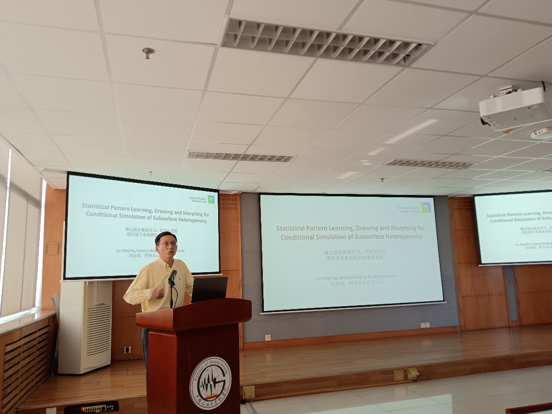 学院第90期GeoFriday学术日活动于2024年11月15日在工科C座757报告厅成功举办。葛新民教授邀请来自沙特阿美北京研究中心的地质学顾问胡林颖博士为师生作题为“Statistical pattern learning, drawing and morphing for conditional simulation of subsurface heterogeneity”的报告。葛新民教授主持报告会,学院50余名师生参会并进行交流。