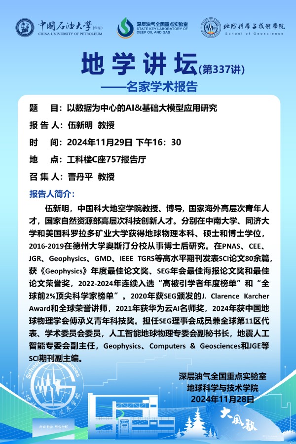 【地学讲坛第337讲】关于 伍新明 教授《以数据为中心的AI&基础大模型应用研究》学术报告的通知