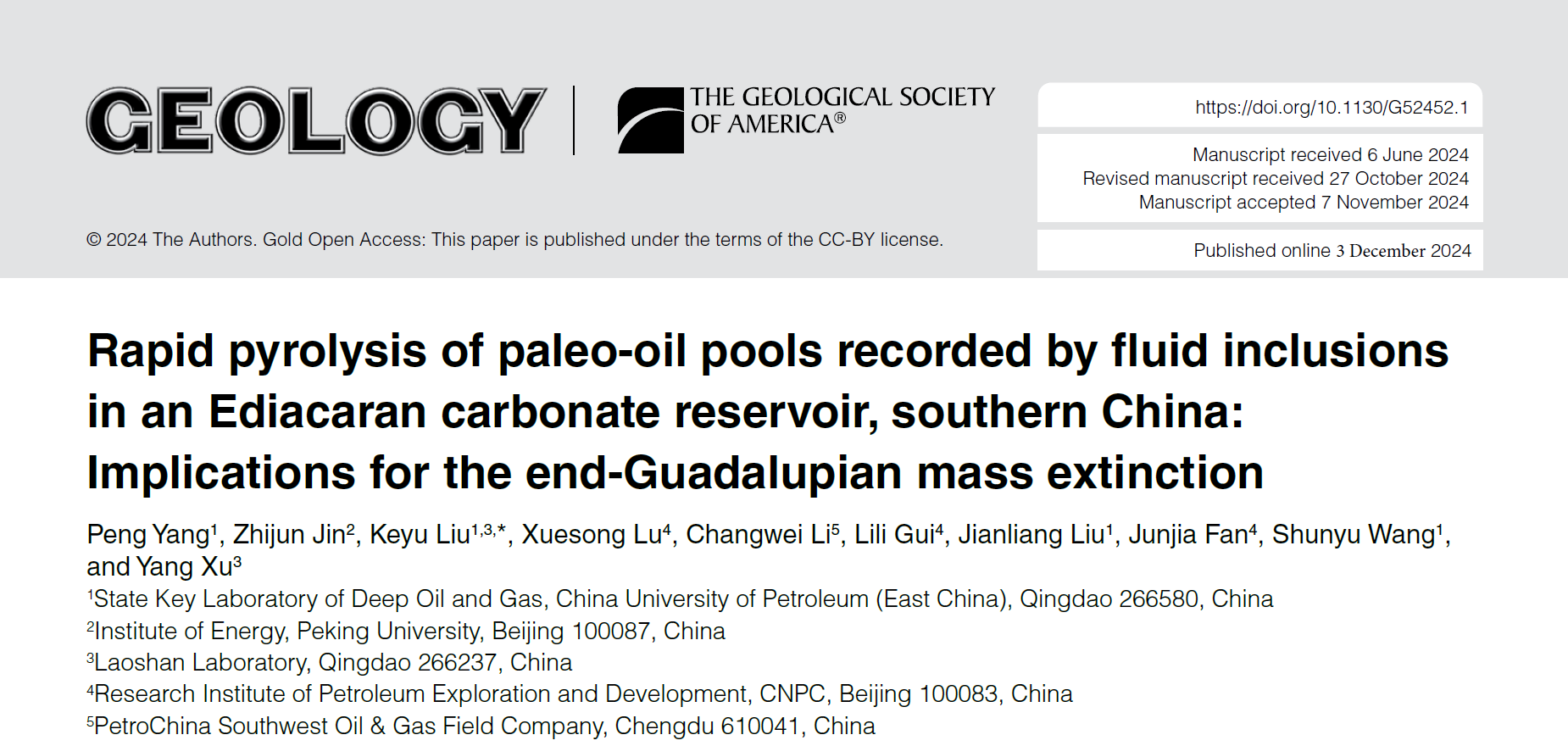 近日,必赢bwin线路检测中心刘可禹教授团队联合北京大学金之钧院士和中石油勘探开发研究院CNPC盆地构造与油气成藏重点实验室等单位在沉积盆地地质流体研究方面取得新进展,相关成果《流体包裹体记录了中国南方埃迪卡拉纪碳酸盐岩储层中古油藏的快速热解:对瓜德鲁普世末期大灭绝的影响》(Rapid pyrolysis of paleo-oil pools recorded by fluid inclusions in an Ediacaran carbonate reservoir, southern China: Implications for the end-Guadalupian mass extinction)发表在地球科学领域国际顶级期刊Geology上。论文第一作者为杨鹏博士后,通讯作者为刘可禹教授;必赢bwin线路检测中心(华东)为第一署名单位,该研究得到国家自然科学基金、中石油科技发展项目、山东省自然科学基金以及中国博士后科学基金项目的联合资助。