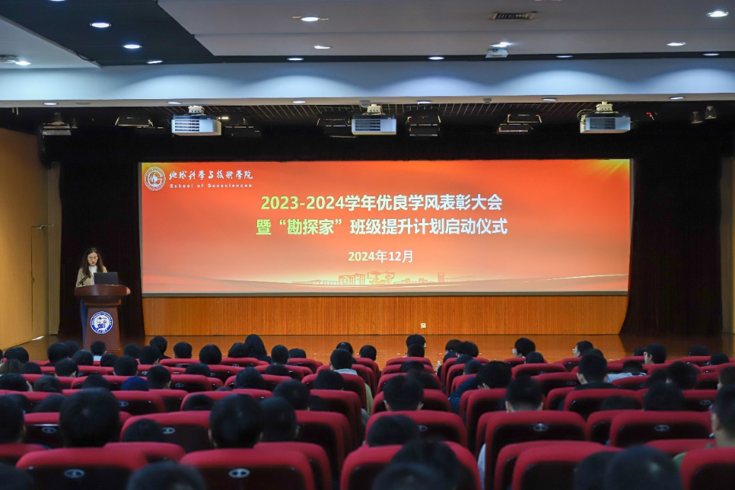 为营造良好的学习风气和育人氛围,表彰上一学年在学风建设中表现突出的班级,继续扎实、深入推进学院学风高质量建设,12月7日下午,学院于逸夫礼堂召开2023-2024学年优良学风表彰大会暨第四期“勘探家”班级学风提升计划启动签约仪式,学院党委副书记郑珊珊及全体专兼职辅导员出席会议,2024级本科生辅导员英飞主持会议。
