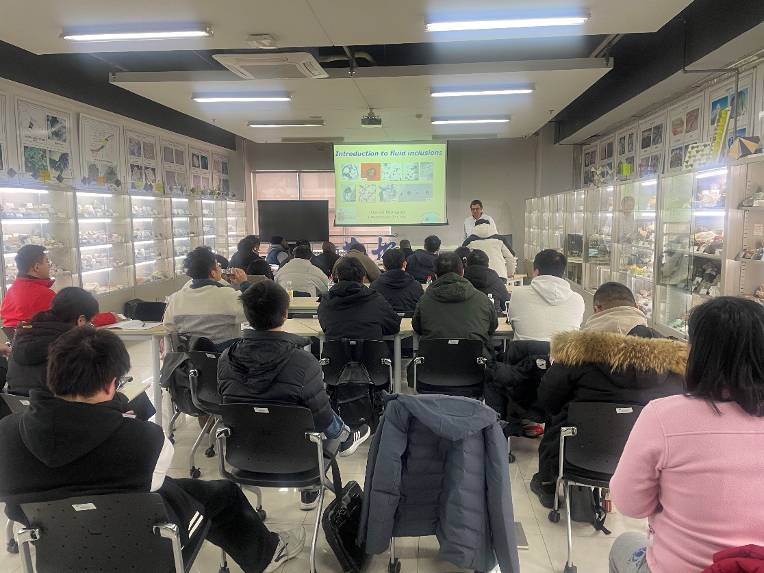 2024年12月19日至2024年12月22日,学院GeoFriday第93期讲座于工科楼C地质博物馆成功举行。王淼特任副教授邀请来自智利大学的Daniel Moncada博士为必赢bwin线路检测中心研究生讲授了《Introduction to fluid inclusions in ore-forming and hydrocarbon systems》的短期课程。学院师生五十余人参加本次交流。
