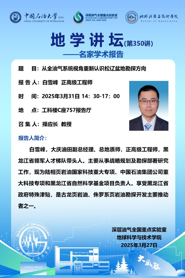【地学讲坛第350讲】关于白雪峰 正高级工程师《从全油气系统视角重新认识松辽盆地勘探方向》学术报告的通知