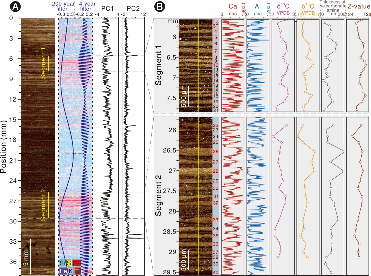 基于时间标尺建立,在薄片尺度上开展了一系列毫米-微米级分析测试,包括XRF元素扫描并对扫描结果进行主成分分析、电子探针线扫描、连续碳酸盐纹层的原位碳氧同位素测试以及年纹层厚度统计,并对上述结果分别进行频谱分析,结果显示明显的200~240年和2.6~8.7年周期。其中200~240年周期与全新世太阳总辐照度揭示的太阳活动周期相对应,并且我们结合沉积环境分析发现研究层段在太阳活动强烈阶段,温暖的气候利于藻类繁殖和碳酸盐沉淀;在太阳活动减弱阶段,页岩中碳酸盐矿物减少。2.6~8.7年周期与ENSO周期一致,反映了年际尺度的暖干-冷湿气候旋回:在温暖干燥的气候条件下,湖水蒸发量增加、湖水δ18O和δ13C值升高、藻类勃发,从而导致形成的碳酸盐纹层较厚;而在相对寒冷潮湿的气候条件下,δ18O和δ13C值较低、碳酸盐纹层较薄。