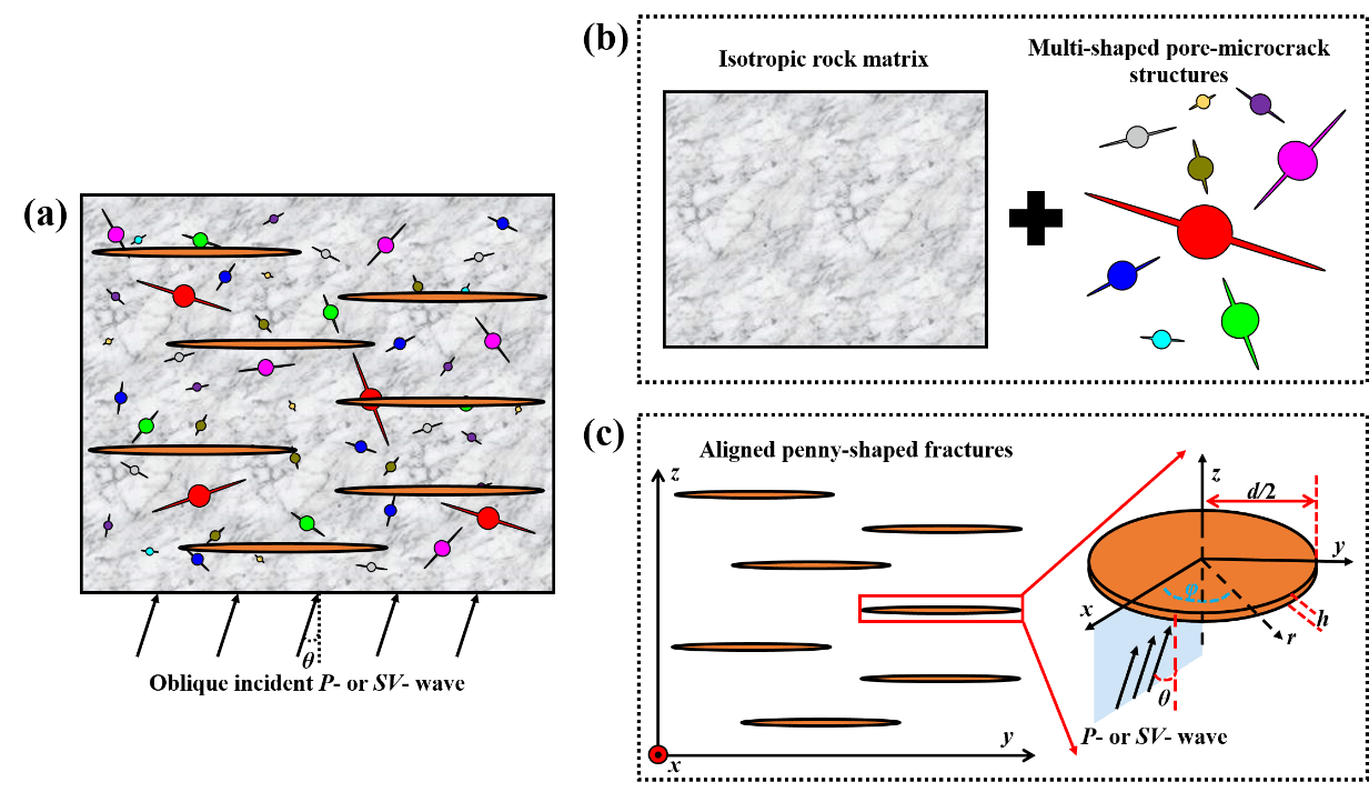 图1.(a)含定向缝的饱和孔隙颜色模型示意图;(b)岩石背景由各向同性岩石基质和多形态孔隙-微裂纹结构组成;(c)定向裂缝假设为硬币型