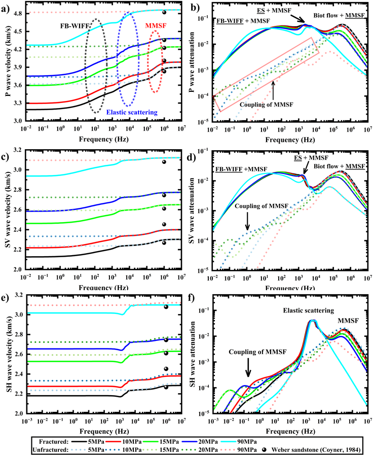 图2.不同压力下含缝岩石P波(0°入射)、SV和SH波(45°入射)的速度频散和衰减