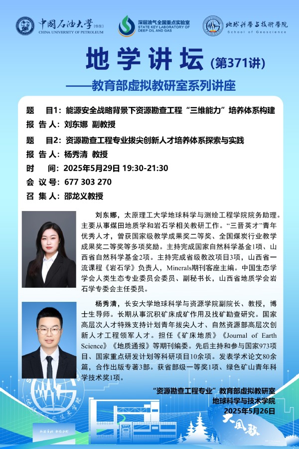 【地学讲坛第371讲】教育部虚拟教研室活动-关于刘东娜副教授 《能源安全战略背景下资源勘查工程“三维能力”培养体系构建》讲座及杨秀清教授《资源勘查工程专业拔尖创新人才培养体系探索与实践》讲座的通知