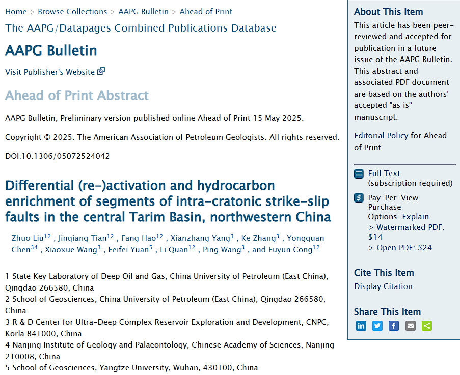 论文信息:Zhuo Liu, Jinqiang Tian, Fang Hao, Xianzhang Yang, Ke Zhang, Yongquan Chen, Xiaoxue Wang, Feifei Yuan, Li, Quan, Ping Wang, Fuyun Cong, 2025, Differential (re-)activation and hydrocarbon enrichment of segments of intra-cratonic strike-slip faults in the central Tarim basin, northwestern China. AAPG Bulletin, doi: 10.1306/04302523125.