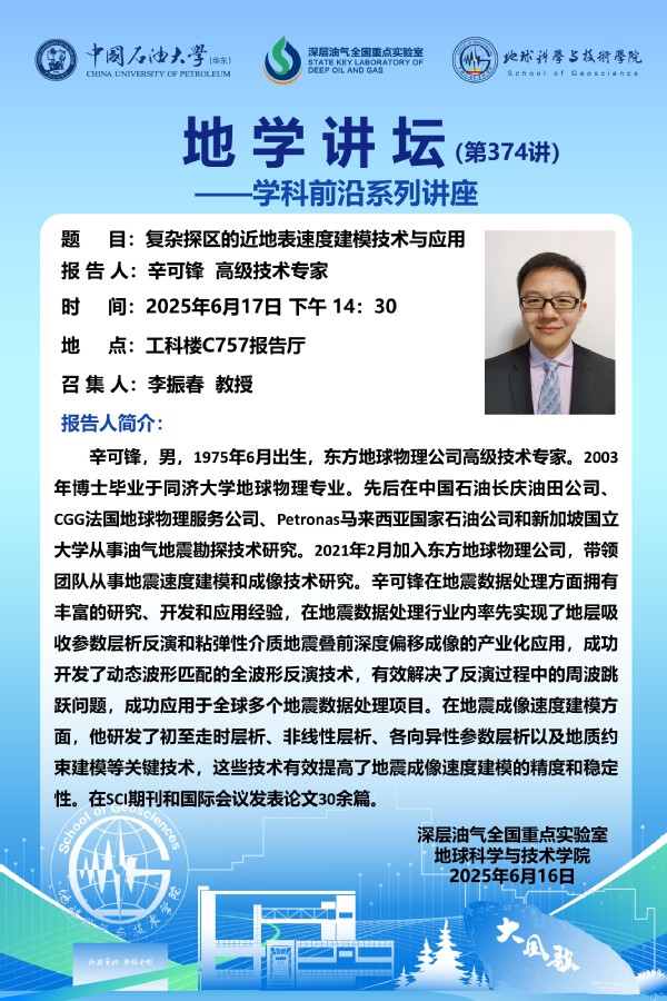 【地学讲坛第374讲】关于辛可锋 高级技术专家《复杂探区的近地表速度建模技术与应用》学术报告的通知