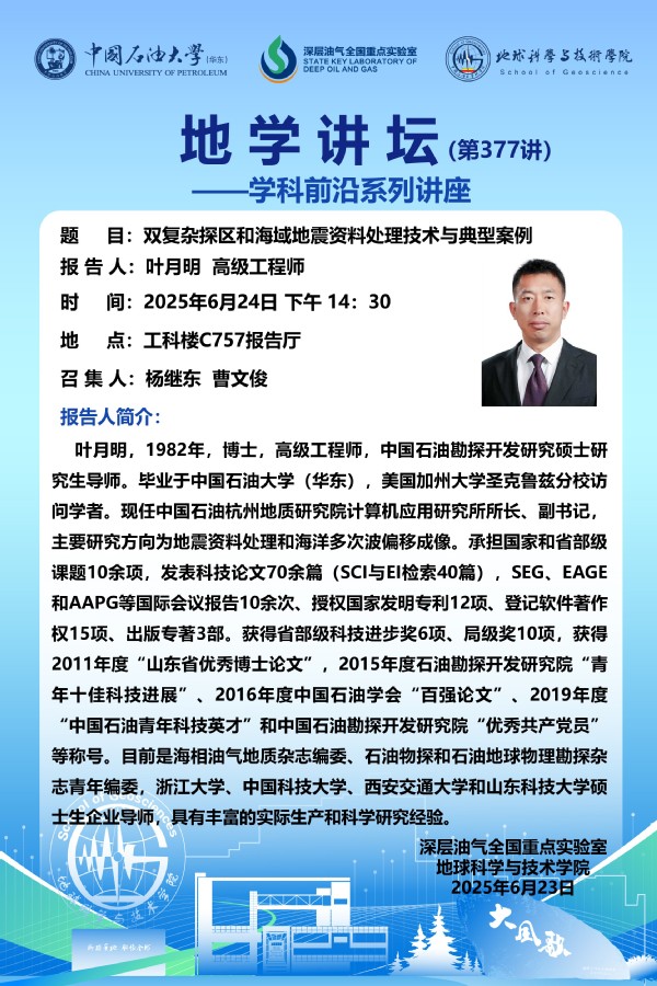 【地学讲坛第377讲】关于 叶月明 高级工程师《双复杂探区和海域地震资料处理技术与典型案例》学术报告的通知