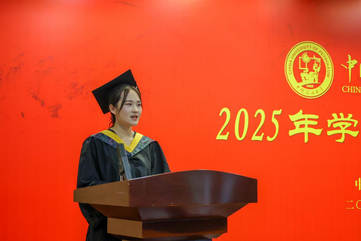本科生毕业生代表、勘查技术与工程(物探)2101班谷佳莹分享了自己与石大和地学院相识、相知、相惜的美好记忆和成长感悟,她表示,学院“脚踏实地,胸怀全球”的院训,让同学们在别人满足于“合格”时而追求尽善尽美的突破。在未来,无论未来是奔赴勘探一线,还是投身科研创新,本届毕业生都将带着石大赋予的使命前行,在各自的岗位上发光发热,为国家发展贡献力量。