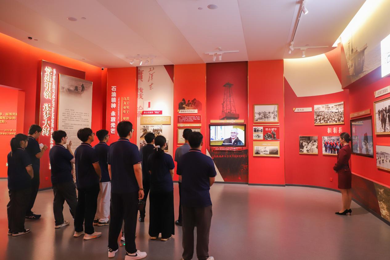 7月22日下午,实践团抵达中海油天津分公司全国科学家精神教育基地及海油精神践行基地。在基地展厅,实践团成员通过历史文献、实物模型和影像资料,系统学习渤海油田从勘探突破到稳产高产的奋斗历程,深切体会“爱国、担当、奋斗、创新”的新时代海油精神。