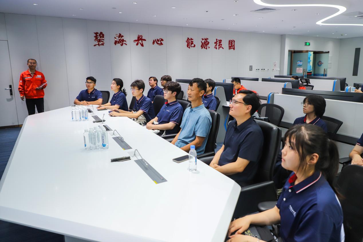 在渤海油田秦皇岛36-2作业公司智能油田中心,实践团成员现场观摩了中海油天津分公司智能油田管理系统,借助现代化信息手段直观了解海上生产一线实际情况。实时跳动的生产数据、智能预警系统和无人巡检技术,彰显了“智慧海油”的前沿实践,让同学们深刻认识到数字化转型对能源产业高质量发展的战略意义。
