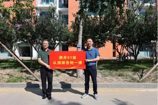 测井91级1班班长刘亮作为校友代表发言。他动情谈到,毕业三十年后重返母校,心情尤为激动。尽管同学们已经离开学校多年,但老师的教诲始终铭记于心,母校精神如银杏般坚韧,一直陪伴同学们成长。认捐这棵树,既是对母校的感恩,也是对学校的祝愿,希望母校未来发展如同银杏一样,根基永固,枝繁叶茂。