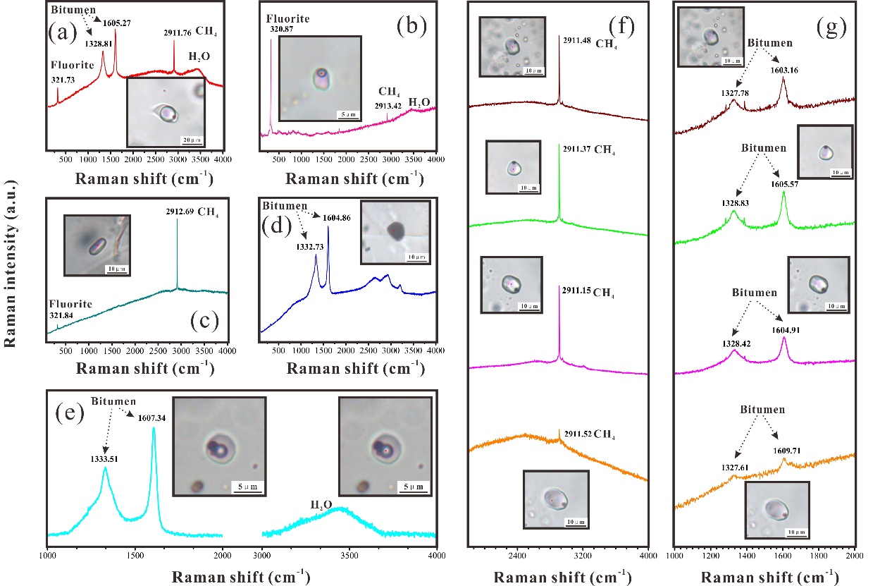 图2. 烃类包裹体照片及其拉曼光谱