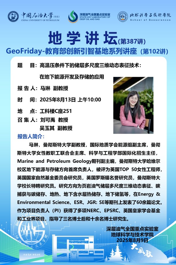 【地学讲坛第387讲】关于马琳 副教授《高温压条件下的储层多尺度三维动态表征技术:在地下能源开发及存储的应用》学术报告的通知