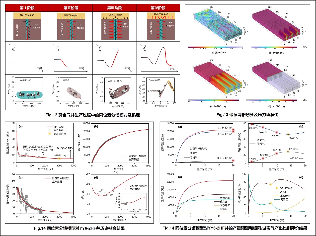 本研究作者们在前人研究的基础上首次建立了适用于页岩气井生产过程的同位素分馏模型,定量揭示了页岩气生产过程中的同位素分馏机理,利于可以该模型可实现页岩气井生产过程中的产量预测和吸附/游离气产出比例评价。这些发现为天然气运移同位素分馏现象和页岩气井生产动态评价提供了理论支持。对于热演化程度较低的地层含水率较高(例如煤岩储层和部分浅层的页岩储层),气水两相流动对甲烷碳同位素分馏的影响暂不清楚,还需要开展进一步的研究工作。