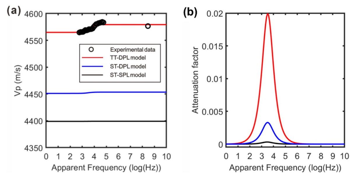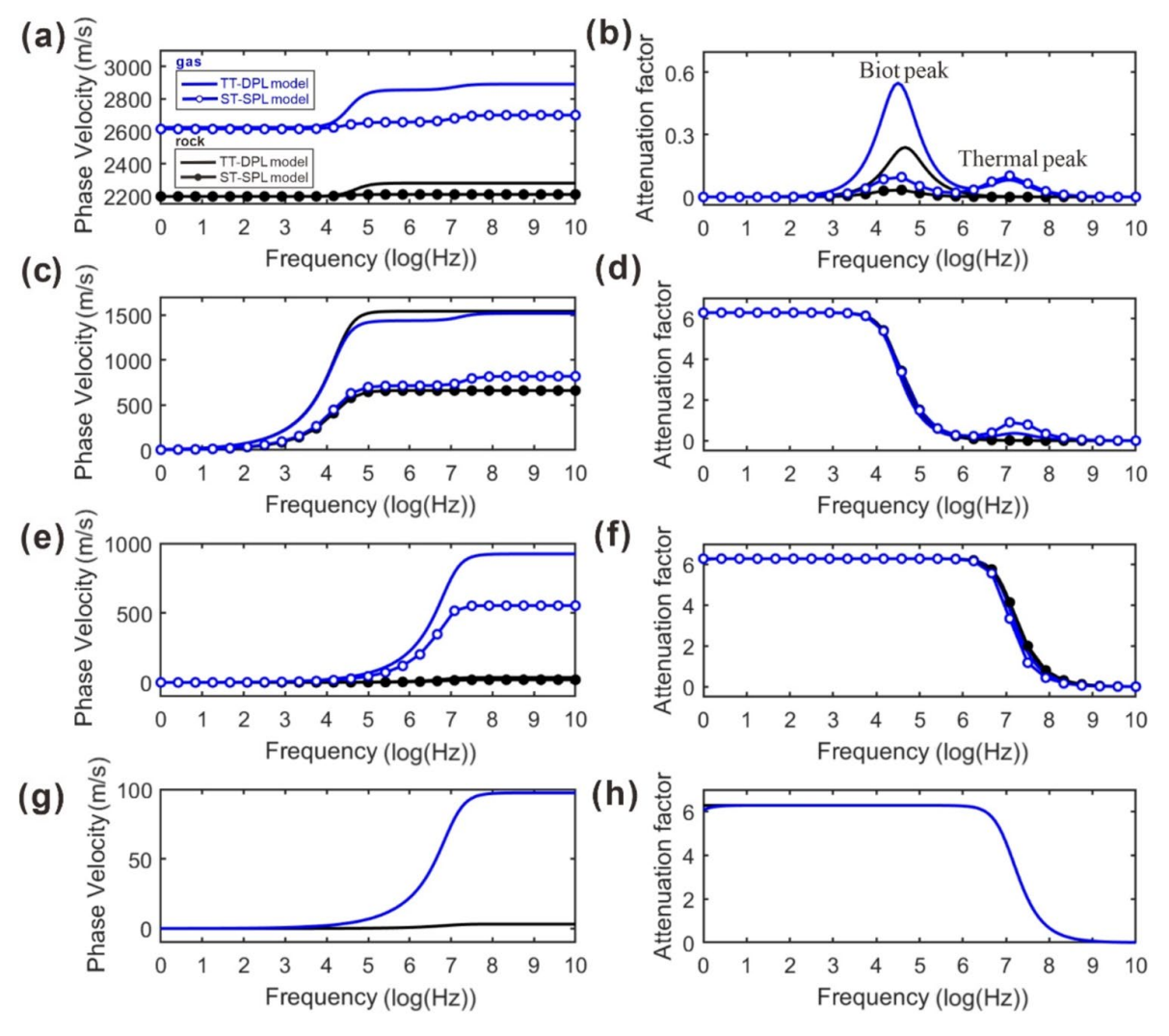 储气(CO2、氢、天然气等)封存、地热循环开采、超深油气储层等流固耦合系统对温度变化极其敏感,固体骨架与孔隙流体之间往往存在巨大的温度与热物性差异,这种强烈的流固热耦合效应,显著影响弹性波的耗散与衰减,如何科学介入流固耦合系统的热效应迄今缺乏理论探索。本文提出一种双温度双相滞后(TT-DPL)热孔隙弹动力学理论,其解析解揭示了多孔岩石内流-固热交换机制对波传播的影响(图1),甘油饱和砂岩超声测量实验数据(圆点)验证:TT-DPL模型预测(红色实线)明显优于忽略流固热膨胀差异的单温模型(ST-SPL和ST-DPL),建立的热-流-固耦合地震模型,为储气(CO2、氢、天然气等)封存和地热循环开采的地震波长期监测,以及超深油气储层地震探测奠定了理论基础。