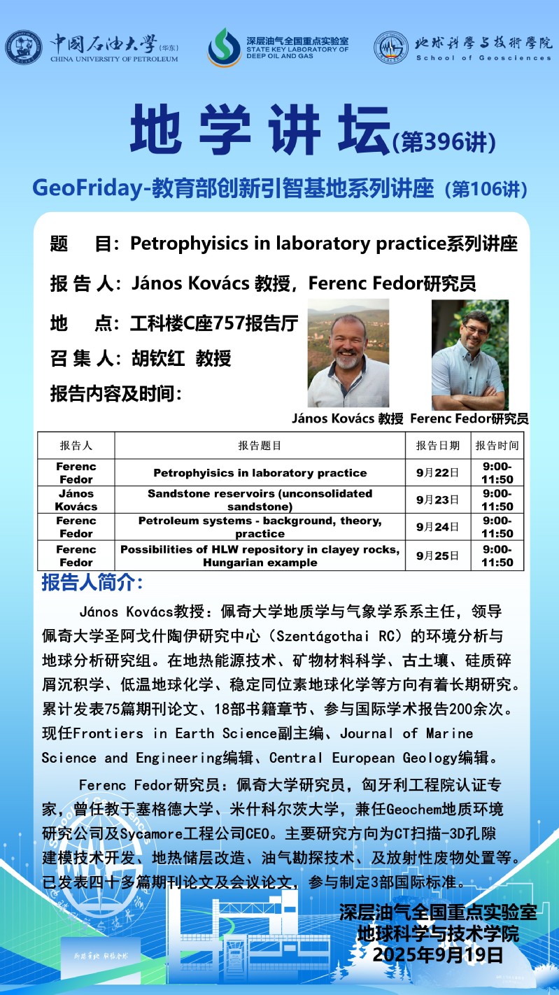 【地学讲坛第396讲】关于János Kovács 教授和Ferenc Fedor研究员《Petrophyisics in laboratory practice》系列讲座的通知