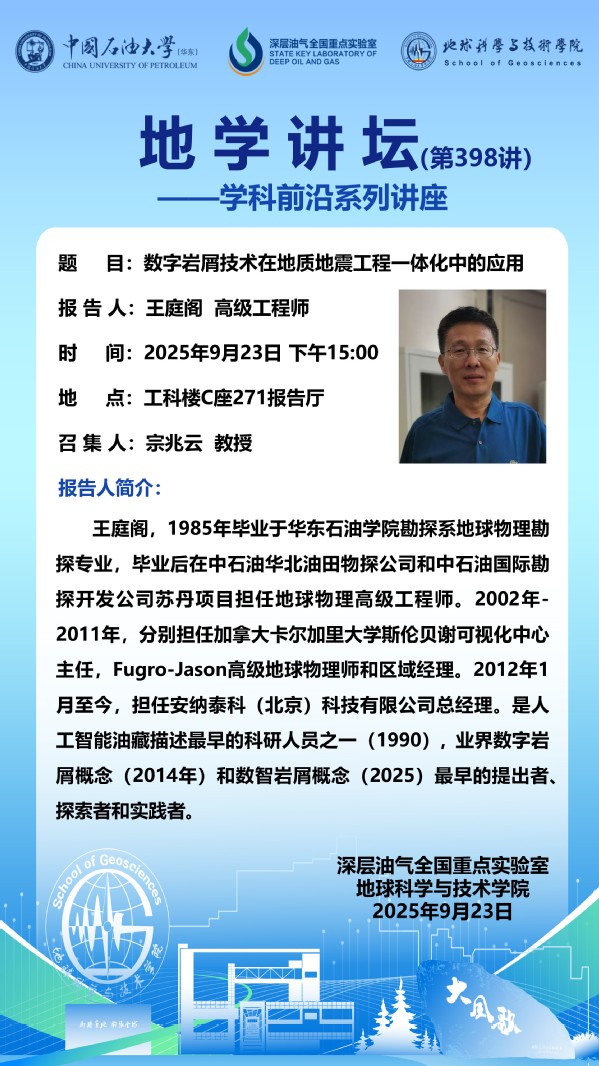 【地学讲坛第398讲】关于王庭阁高级工程师《数字岩屑技术在地质地震工程一体化中的应用》学术报告的通知