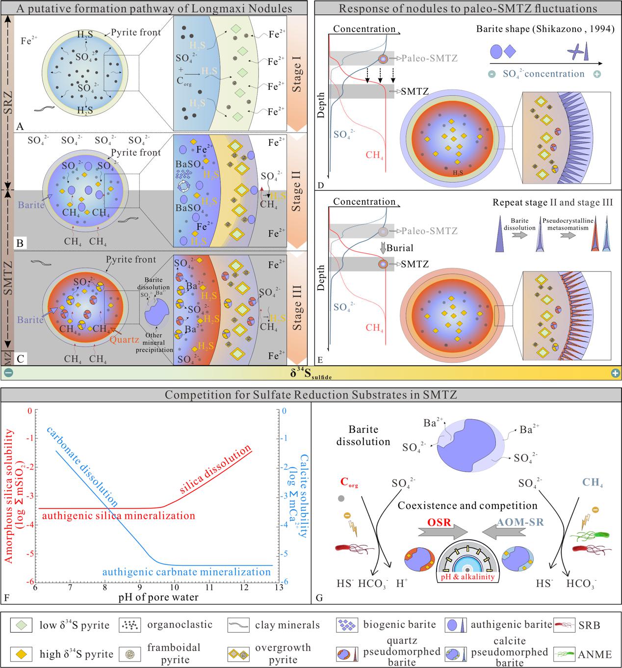 在“均质”结构结核中,边缘的δ34Spyr含量为8.6‰,显著低于中心的18.8‰。在颗粒尺度上,单个黄铁矿颗粒的δ34S范围为−1.9‰到29.1‰。我们提出,“均质”结构结核的形成经历了三个阶段:(1)结核胚胎在硫酸盐还原带内形成,基于扩散-沉淀模型形成(34S-亏损)黄铁矿边缘;(2)在SMTZ内,重晶石发生溶解和再沉淀,通过形成较大粒度的成岩重晶石促进结核体生长。同时,AOM–SR作用下,SMTZ顶部附近的残余富集34S的硫酸盐池及溶解重晶石释放的硫酸盐均被还原,生成富集34S的自形黄铁矿;(3)SMTZ之下,硫酸盐的枯竭导致重晶石被其他矿物大规模取代。“圈层”结构结核体外部的针状过度生长区域表明其经历了显著的后期改造。其初始阶段与“均质”结构结核体类似,而边缘的针状矿物则是SMTZ垂向迁移的结果。此外,常与SMTZ密切相关的方解石在这些结核中相当罕见。相反,石英取代方解石成为结核基质,并普遍发生对重晶石的假晶交代。我们提出,结核中石英,而非方解石的显著富集源于古SMTZ内OSR(有机碎屑硫酸盐还原作用)的发生。该过程改变了孔隙水的pH值和碱度,促进石英的沉淀,为追踪古SMTZ内的OSR反应提供岩石学印记,也为反演古海洋有机碳-甲烷-硫酸盐通量比例提供线索。