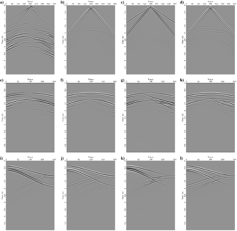 图1.断层模型模拟炮集,第一行检波点位于地表,其中(a)和(b)为传统速度x和z分量,(c)和(d)为应变率x和z分量;第二行检波点位于水平井,其中(e)和(f)为传统速度x和z分量,(g)和(h)为应变率x和z分量;第三行检波点位于垂直井,其中(i)和(j)为传统速度x和z分量,(k)和(l)为应变率x和z分量