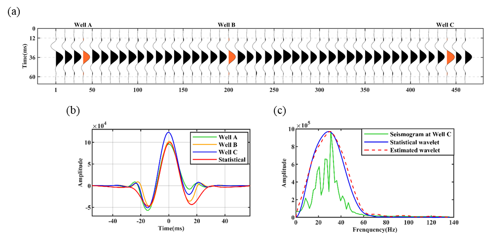 图2. (a) 每隔10道显示的估计子波剖面;(b)井位处的子波估计结果;(c)子波振幅特征对比