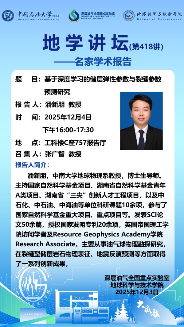 【地学讲坛第418讲】关于潘新朋教授《基于深度学习的储层弹性参数与裂缝参数预测研究》学术报告的通知