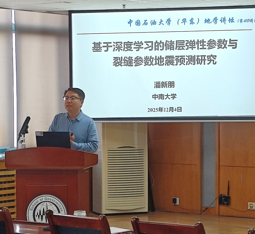 2025年12月4日下午,地学讲坛第418讲在工科C757举行,中南大学地球科学与信息物理学院潘新朋教授应邀作题为《基于深度学习的储层弹性参数与裂缝参数预测研究》的学术报告。报告由张广智教授主持,吸引了众多师生及科研人员参与。