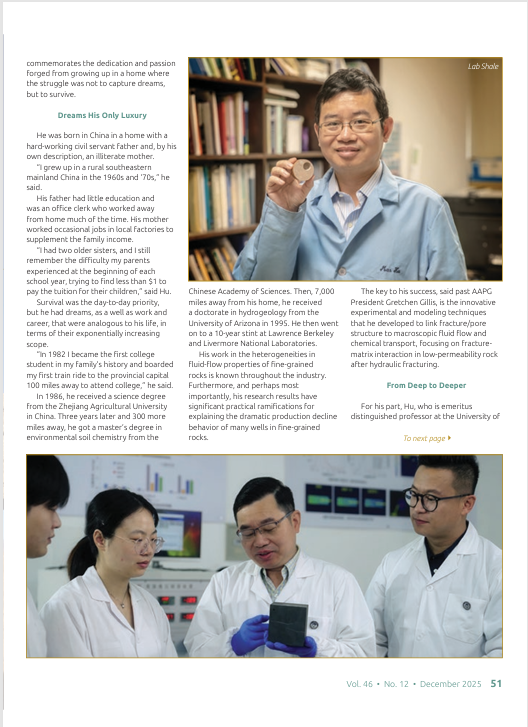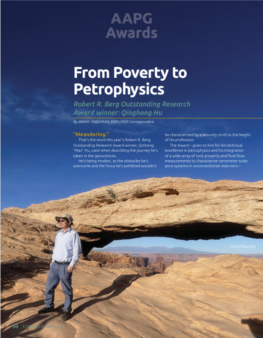 荣誉的背后,是一条他自称“曲折”的道路——一条从中国东南部农村跋涉至全球纳米岩石物理学顶峰的非凡旅程,这在2025年12月《AAPG Explorer》的专版报道中有充分展示。